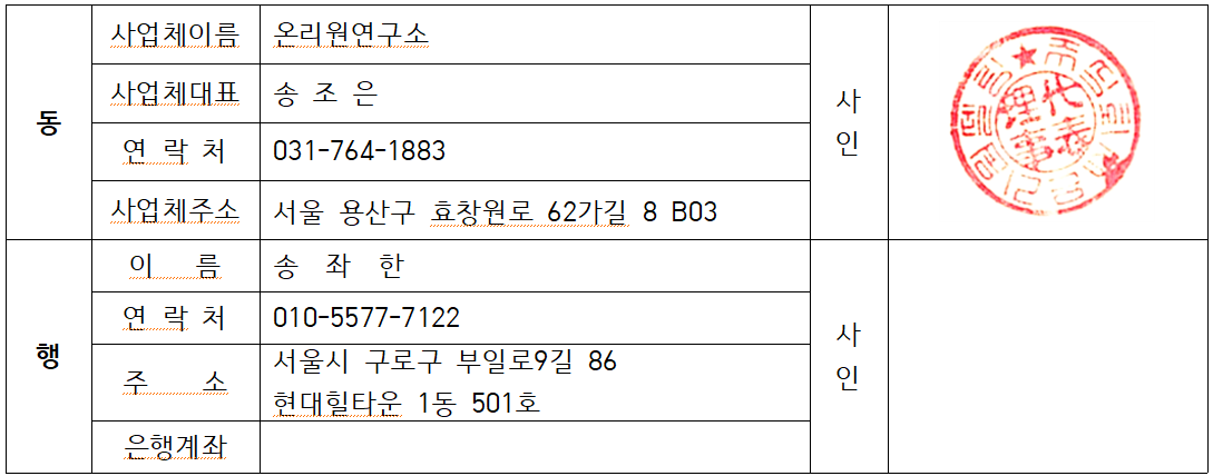 3. ‘동'과 '행'은 상기내용을 숙지하고 이행할 것이며 본 계약서를 작성하여 이미지 싸인을 입력하고 PDF로 작성하여 각 1부씩 보관하며, 위의 사항은 '행'과 계약이 체결된 날로부터 본 계약은 정식효력을 갖는다.
